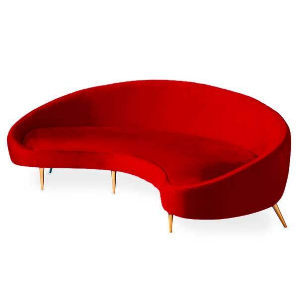Великолепный трехместный диван Halfring красного цвета с металлическими ножками золотого цвета и обивкой из шикарного вельвета.